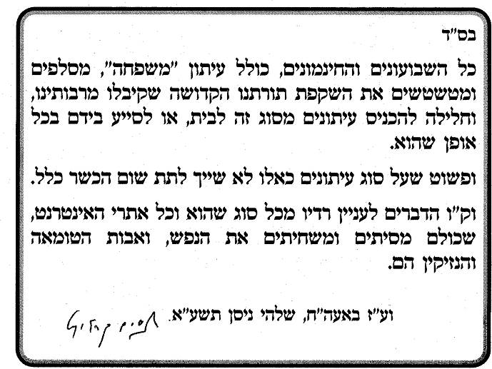 Letter About "Weeklies" (including Mishpachah), Radio and Internet