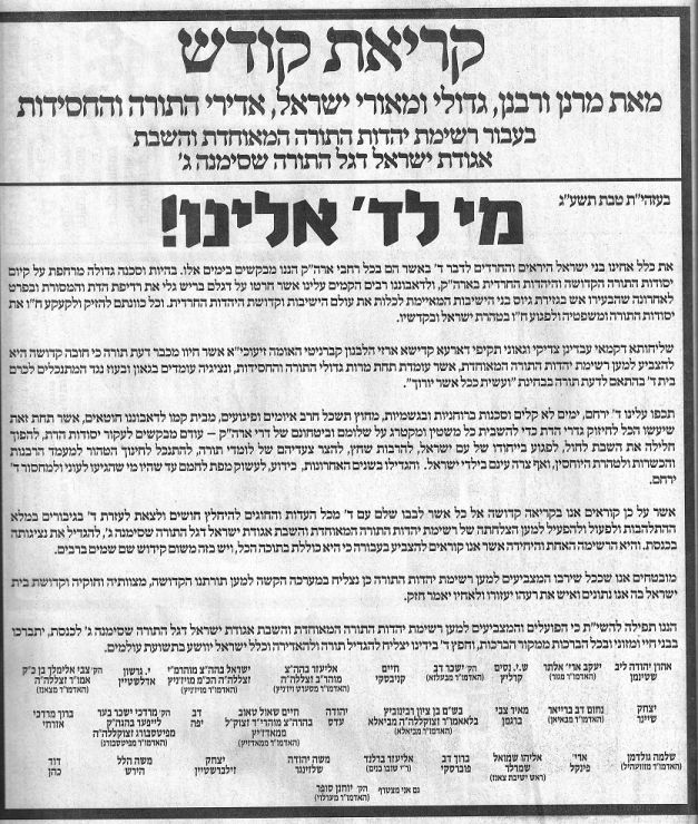 AAs election day draws near (the 19th Knesset is scheduled to be elected Tuesday 11 Shvat/January 22) events have been held all over the country in chareidi community to try to impress upon people the importance of the upcoming election. On Tuesday a Kol Korei was issued signed by 28 rabbonim, roshei yeshiva and admorim. Also a short expression of support was published that was signed by 56 roshei yeshiva , and a long letter of support was released by HaRav Mordechai Gross. In addition, boxes appear daily announcing that various chassidic admorim expressed their support for United Torah Judaism.