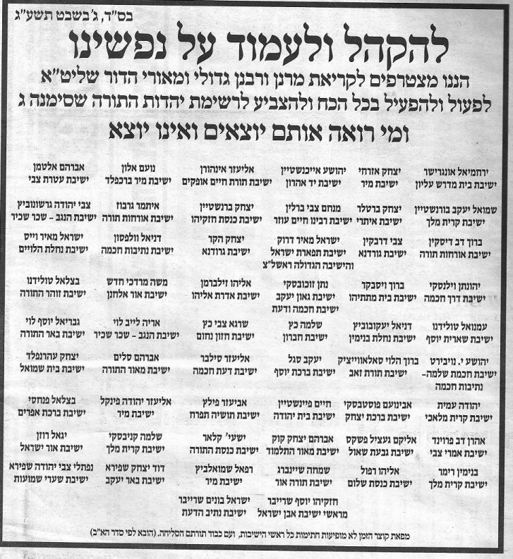 "It was written in the time of HaRav Aharon but it is all the more true today that the threats facing us regarding religious practice are greater. How much more must we work for the party's victory through increasing the power of our bnei Torah representatives, aside from prayer and general support for its success." He added, "If the government sees that the public is not standing full force behind the Torah party, they will conclude that we are not united and subservient [to our leadership] and will attempt to draft yeshiva students."