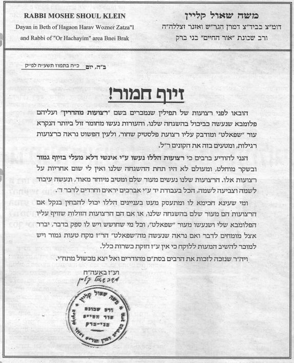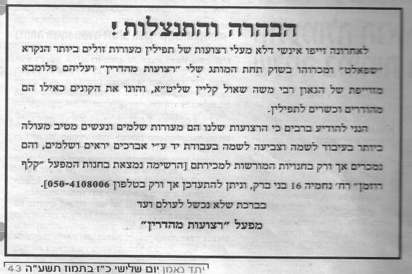 It was clear that these retzuos were not really manufactured by the Retzuos Mehadrin factory nor were they under the supervision of HaRav Moshe Klein, despite labeling indicating this to be the case. (See the letters of HaRav Klein, and the Retzuos Mehadrin factory, protesting the forgery of their names.)