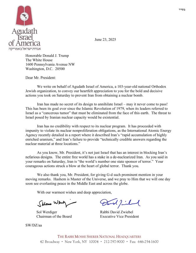 A letter was sent by Mr. Sol Werdiger, Chairman of the Board of Agudath Israel of America and Rabbi Chaim Dovid Zwiebel, Executive Vice President of Agudath Israel of America, to President Donald Trump, thanking him for his decisive action in Iran.